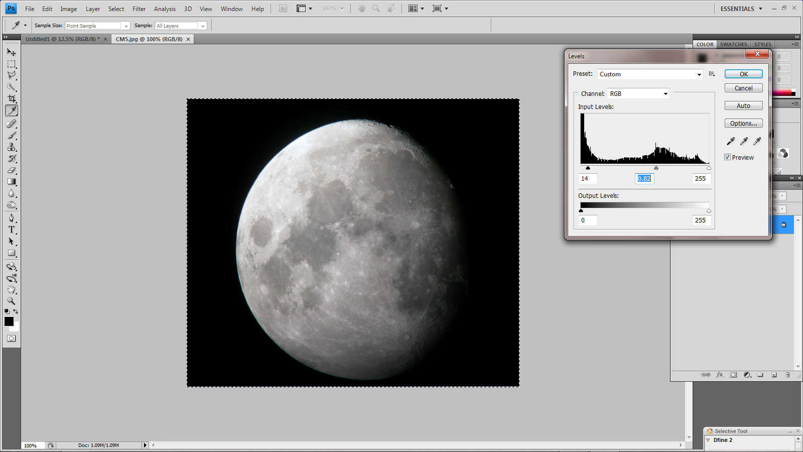 First, in Levels (Image > Adjustments> Levels) the left slider (to adjust the ‘black point’) and mid point sliders were adjusted to produce a better image.