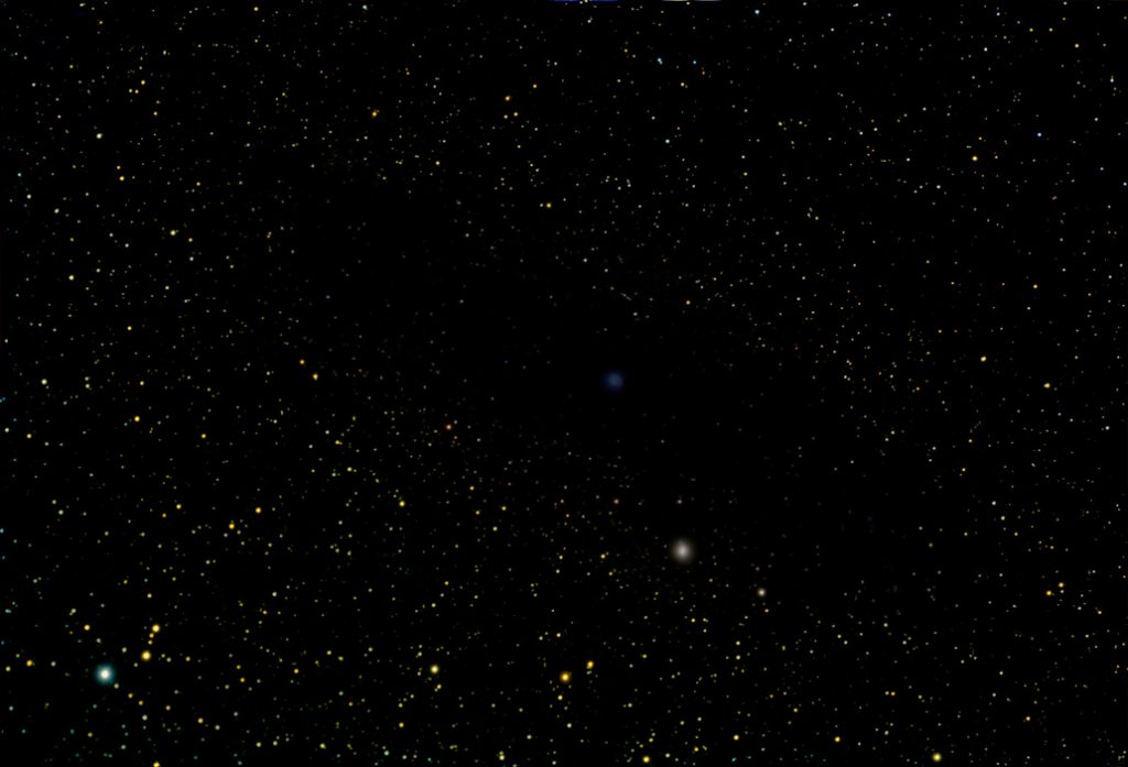 A total of 290, 18 second, frames were taken under the control of SharpCap Pro and saved as Tiff files – so 87 minutes total exposure. The camera sensor temperature was set at -15 C and 46 dark frames at the same temperature, gain and exposure were taken. Flat frames were definitely not needed and, as I think bias frames are not needed if dark frames are taken at the same temperature and exposure time, none were taken.